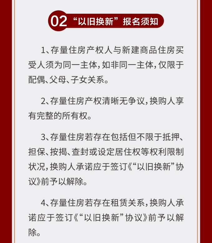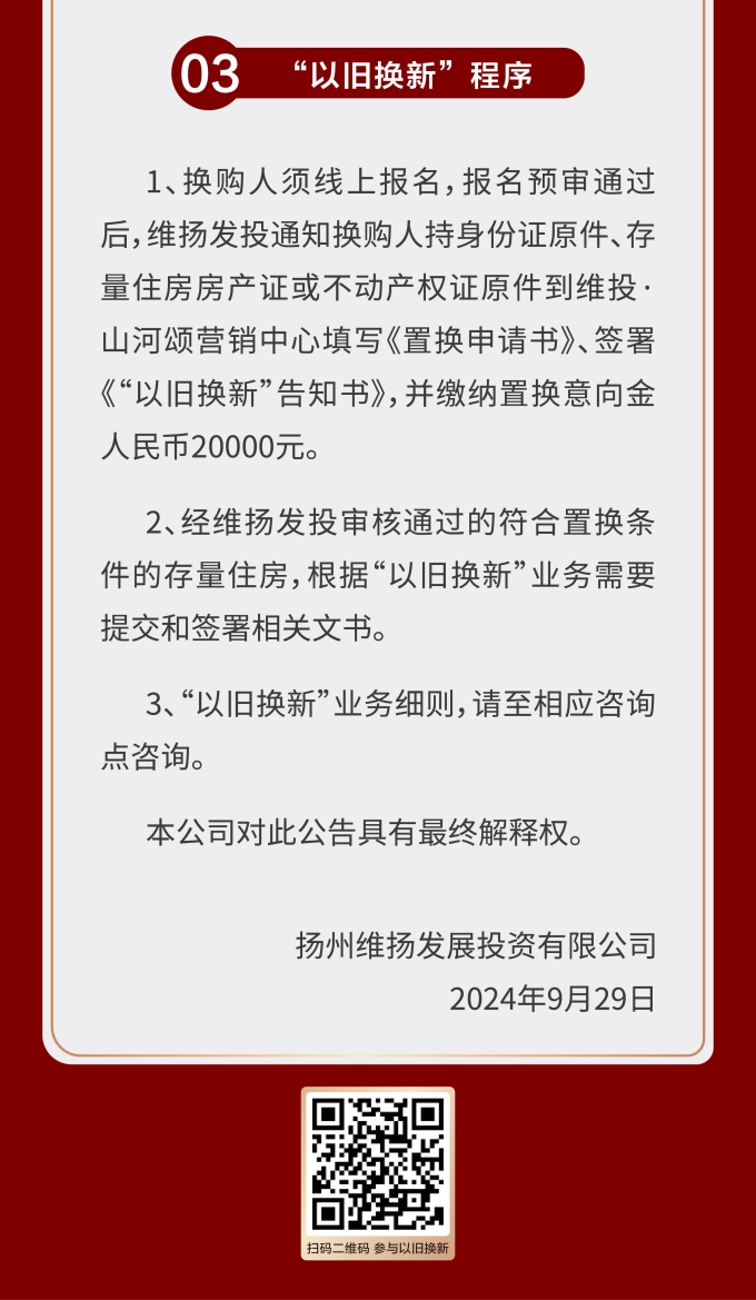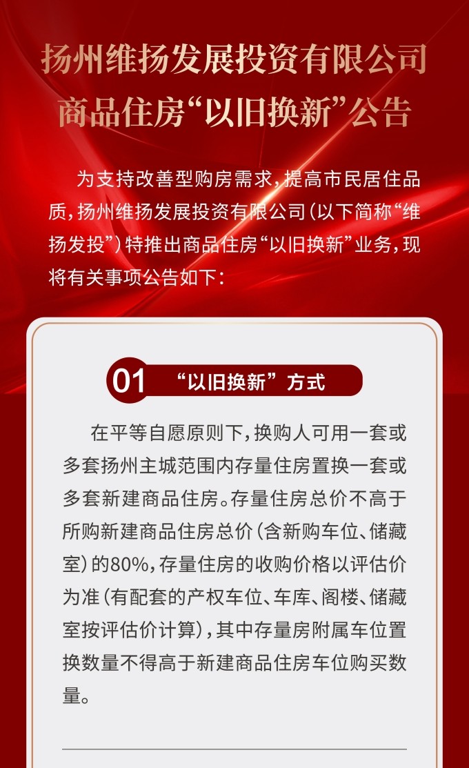 維揚(yáng)地產(chǎn)積極響應(yīng)政府新推行的“以舊換新”政策,踐行“惠民”理念,打造高品質(zhì)住宅,滿(mǎn)足揚(yáng)州人民改善型住房需求。此次維揚(yáng)發(fā)投“以舊換新”工作以其自主開(kāi)發(fā)的維投·山河頌項(xiàng)目為試點(diǎn),由國(guó)企背書(shū)、置換范圍廣、全流程專(zhuān)業(yè)服務(wù)。首批換購(gòu)新建商品住房限額50套,換購(gòu)人可通過(guò)登錄“維揚(yáng)發(fā)投商品住房‘以舊換新’線上報(bào)名系統(tǒng)”報(bào)名,具體要求詳見(jiàn)公告。