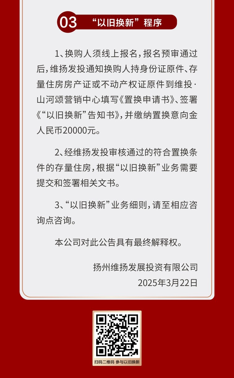 為進(jìn)一步滿足更廣泛客群對于更高居住品質(zhì)、更美好生活的改善需求,維投地產(chǎn)公布了“以舊換新”3.0版本,將維投·山河序也納入置換范圍,預(yù)計本周五(5月23日)正式啟動置換流程,同時接受預(yù)約登記。