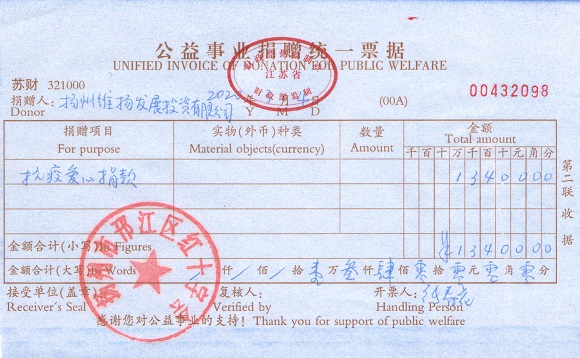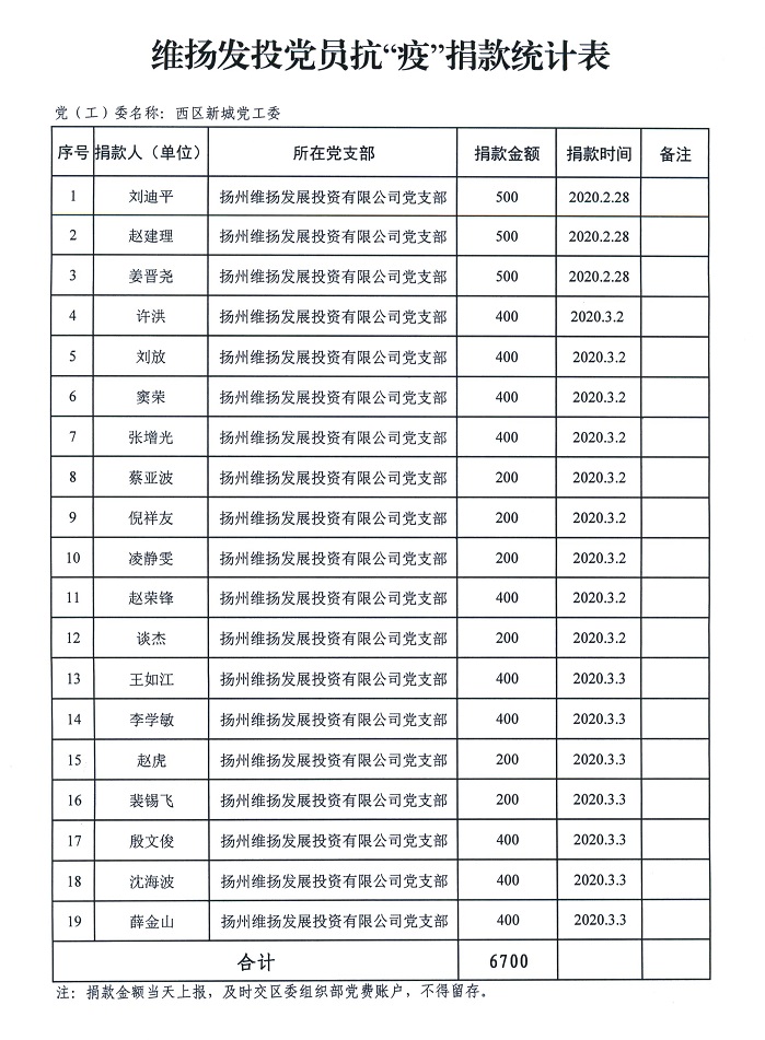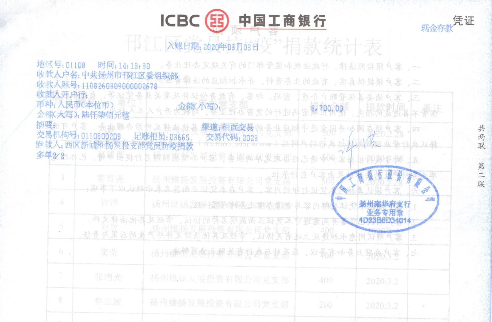 涓流不吝,以成江河。截止目前,公司黨支部一共向邗江區(qū)委組織部賬戶匯入黨員抗疫特殊黨費(fèi)6700元。公司員工及合作單位也籌集了13400元的抗疫愛心捐款,匯款至邗江區(qū)紅十字會(huì)。